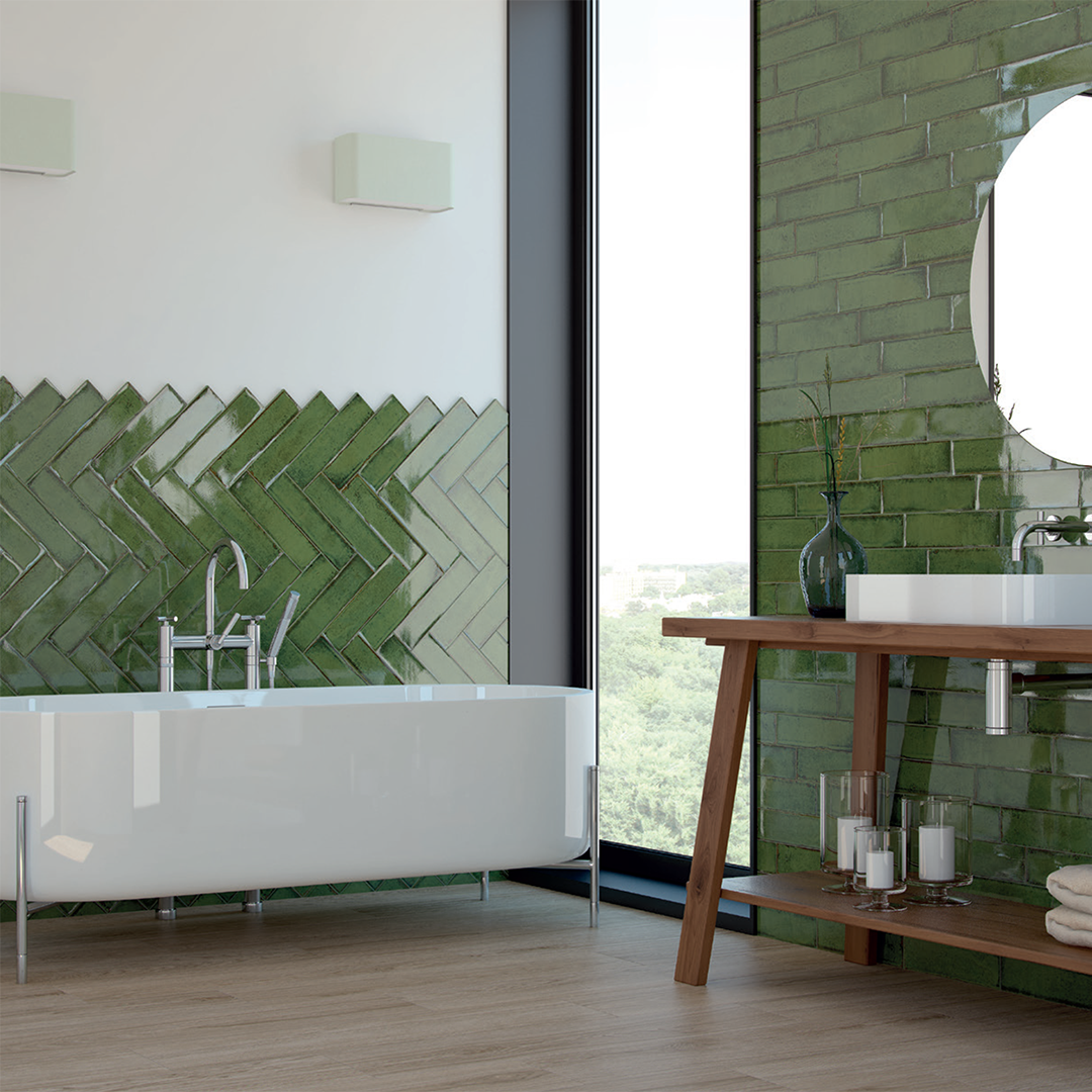 A metro tile that can work in any space, the Alchimia 7,5x30cm wall tiles come in olive green and marine blue.