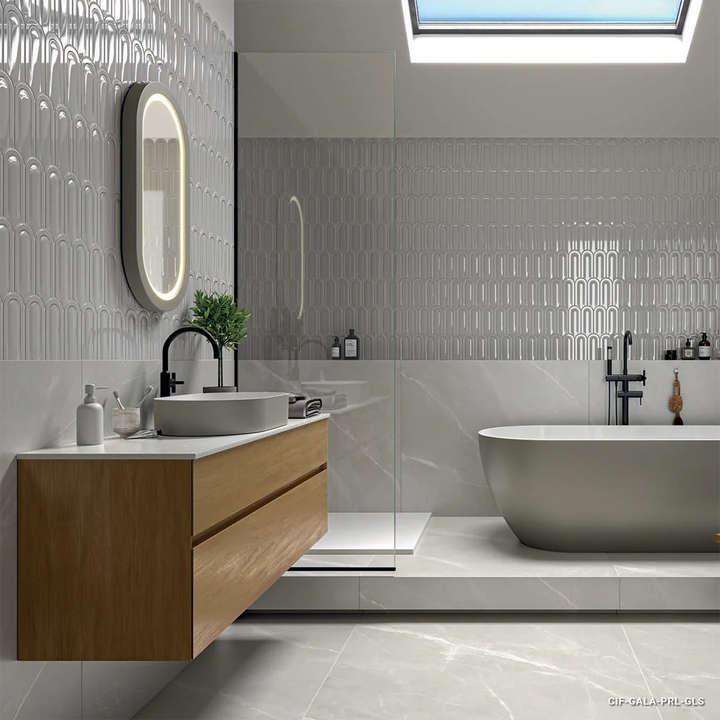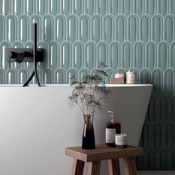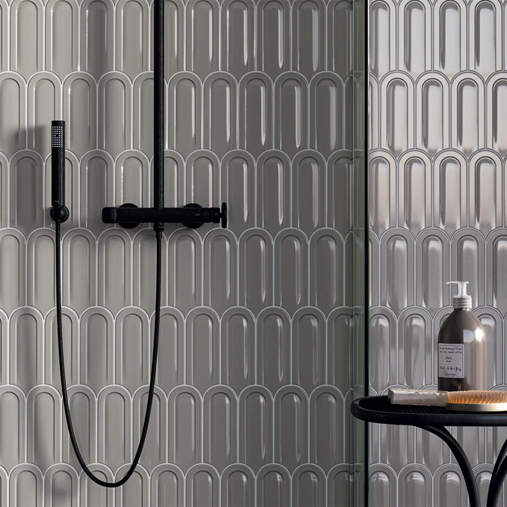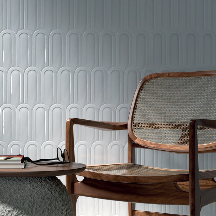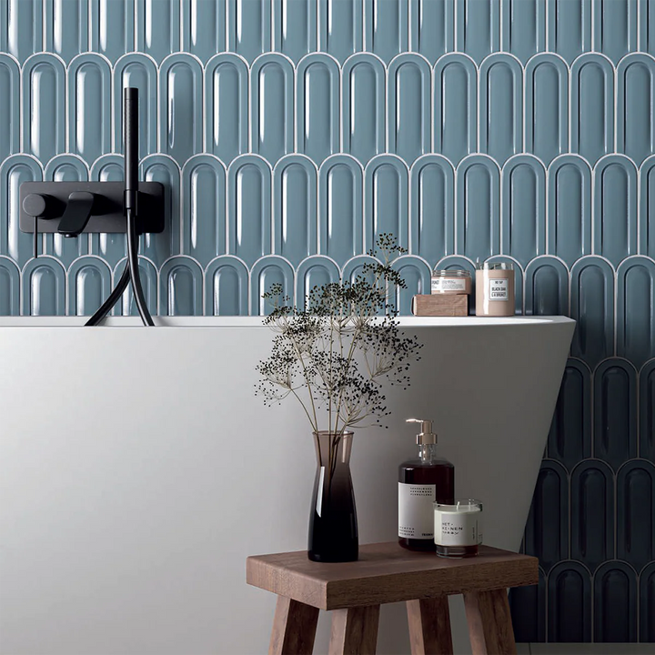 A modern reinterpretation of a classic fish scale tile. Gala features a sleek, glossy 3D finish that adds depth and dimension to any space.